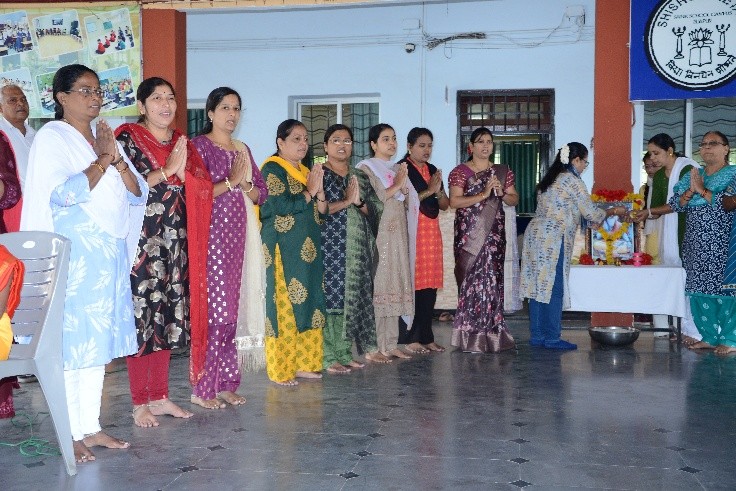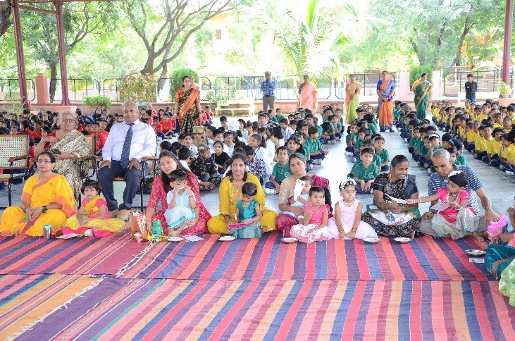 Akshara Abhasya: Akshara Abhasya a ritual for writing first letter for first batch of Nursery section took place on 02 Aug 2025 with zeal and enthusiasm. An Invocation song was sung by senior student of the school, Cdr Meena Kumari Officer-In-Charge performed the Sarswati Pooja and attended the function as parent along with her parents. All nursery class parents participated in Sarswati Pooja with great devotion all the parents gave practice of writing letter “A” holding their child finger in hand in a raw rice plate. The environment was filled with devotional vibes. All the staffs and parents were given puffed rice packets as Akshara Abhasya prasada. All were happy to receive the prasada.